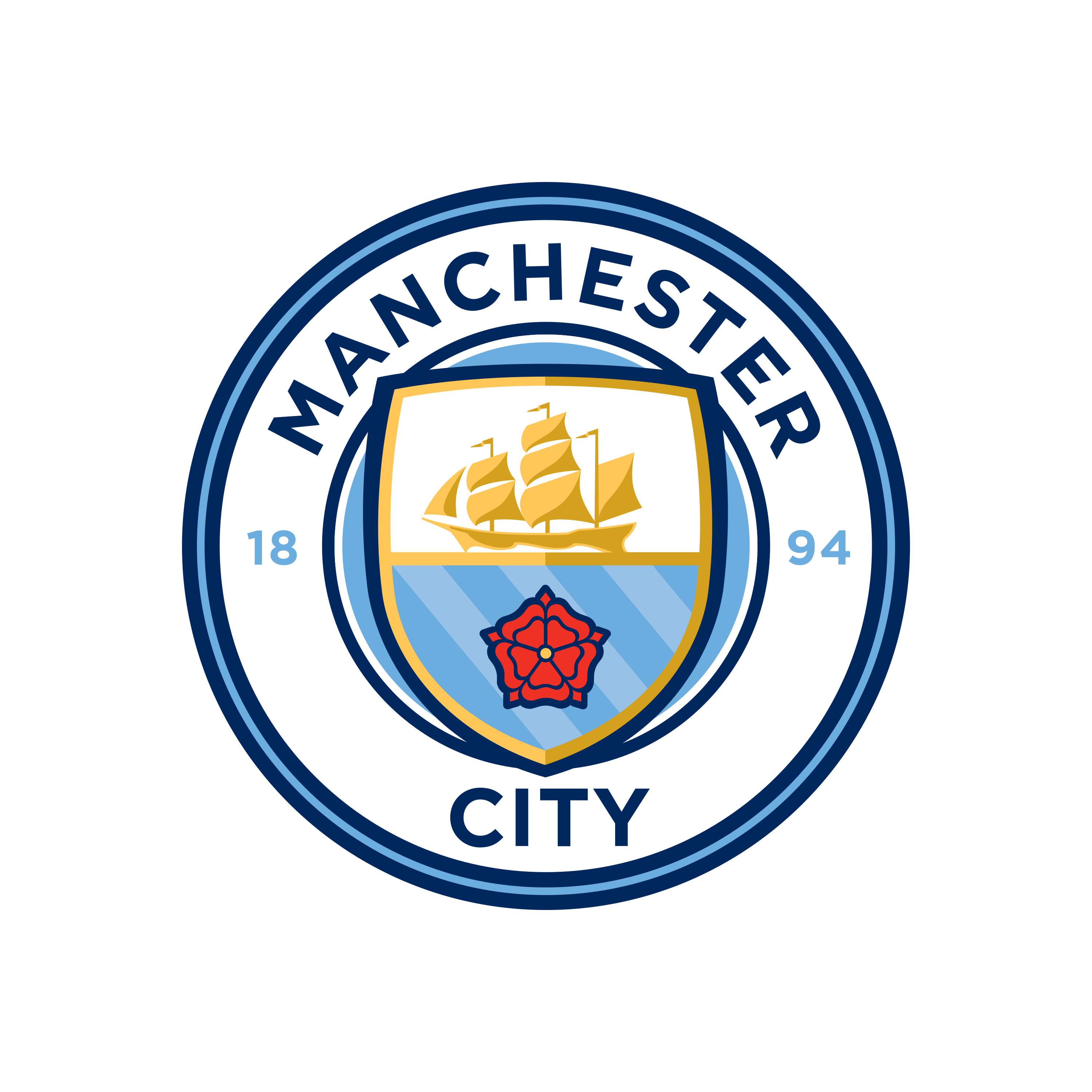 Manchester City F.C. is a dominant professional football club competing in England's Premier League. The club's modern logo is a circular crest, a design inspired by historic fan badges. It prominently features a golden ship, symbolizing Manchester's trade history via its canals, and the red rose of Lancashire. This emblem represents a return to the club's roots while signifying its modern, global brand significance. Download for free the Manchester City F.C. logo in vector (SVG) or PNG file format.
